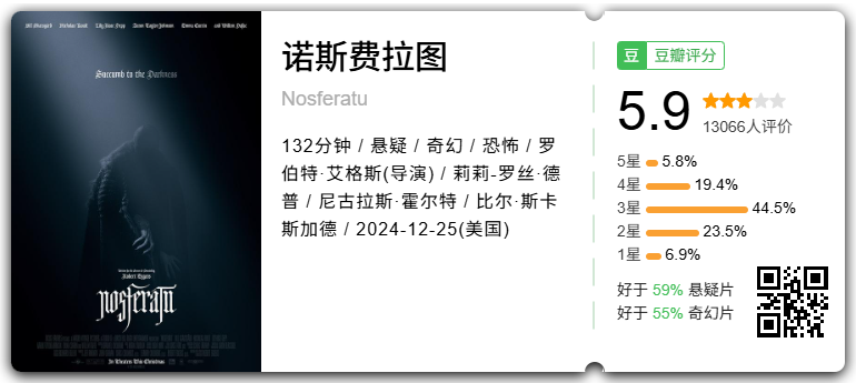 诺斯费拉图 (2024)【4K原盘 / REMUX / HDR】【中英特字 加长版】[已刮削] [悬疑 / 恐怖 / 奇幻] 5.9 高分【72.6G】 8月25日 11 4K专区夸克网盘 DB君 这家伙很懒,什么都没有留下... 关注 已关注 私信 诺斯费拉图的剧情简介 · · · · · · 影片讲述了一个哥特故事,被鬼附身的年轻女子艾伦·亨特(莉莉-罗丝·德普 饰)和迷恋她的可怕的吸血鬼伯爵(比尔·斯卡斯加德 饰)之间的痴恋,造成了难以言喻的恐怖。 奇幻恐怖悬疑