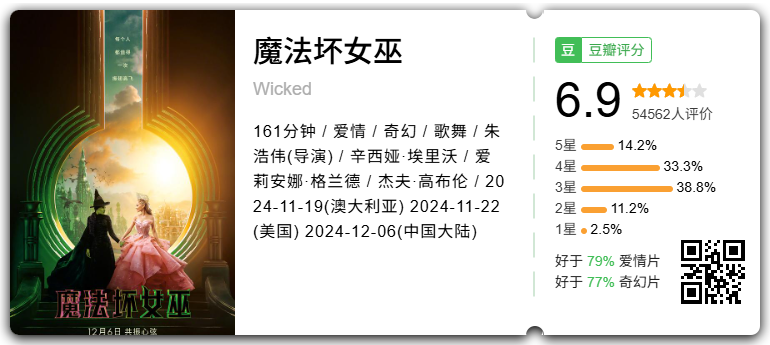 魔法坏女巫 (2024)【4K原盘 / REMUX / HDR】【中英特字】[已刮削] [爱情 / 歌舞 / 奇幻] 6.9 高分【85.4G】 8月25日 15 4K专区夸克网盘 DB君 这家伙很懒,什么都没有留下... 关注 已关注 私信 魔法坏女巫的剧情简介 · · · · · · 影片讲述了奥兹国两位女巫鲜为人知的成长故事。因绿色皮肤而备受误解的艾芙芭(辛西娅·埃里沃 Cynthia Erivo 饰)与光彩夺目、野心勃勃的格琳达(爱莉安娜·格兰德 Ariana Grande 饰)在西兹大学结识,性格迥异的二人却建立起了深厚的友谊。然而,随着与奥兹国大巫师的邂逅,她们的友谊走向十字路口,二人面临着截然不同的命运之路。这段奇幻冒险揭示了友谊、力量与自我发现的真谛。 奇幻歌舞爱情