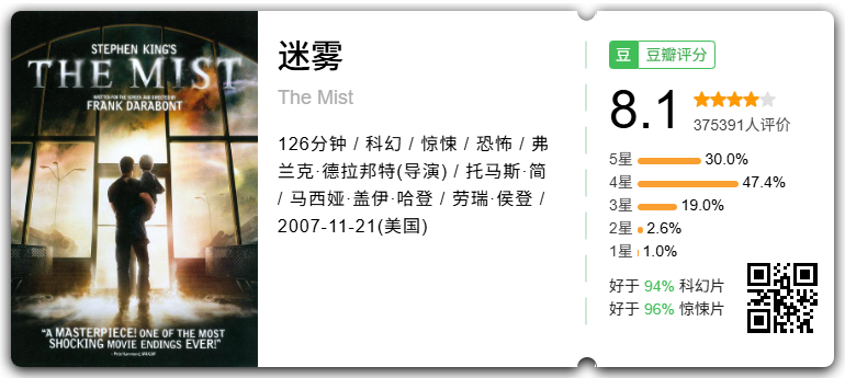 迷雾 (2007)【4K原盘 / REMUX / HDR】【杜比视界】[已刮削][美国] [科幻 / 惊悚 / 恐怖] 英语 / 8.1 高分【85.6G】 8月25日 13 4K专区夸克网盘 DB君 这家伙很懒,什么都没有留下... 关注 已关注 私信 迷雾的剧情简介 · · · · · · 一座风景秀美的小镇被一场突如其来的浓雾瞬间淹没。雾中传来阵阵惨叫,人们惊慌失措地四处逃散。戴维和他的儿子与众多镇上的人被困在小镇超市里,等待雾的消散。浓雾并没有如期望的散开,而走进浓雾的人一去不返。浓雾逐渐露出了它狰狞的面目。恐惧、惊慌、挣扎、悲伤、绝望……人们的精神濒临崩溃。如何才能活着走出迷雾?面对超市里几近癫狂的人们和超市外吞噬一切、不可知的迷雾,戴维紧紧搂着儿子,开始了艰难的求生之路…… 恐怖惊悚科幻